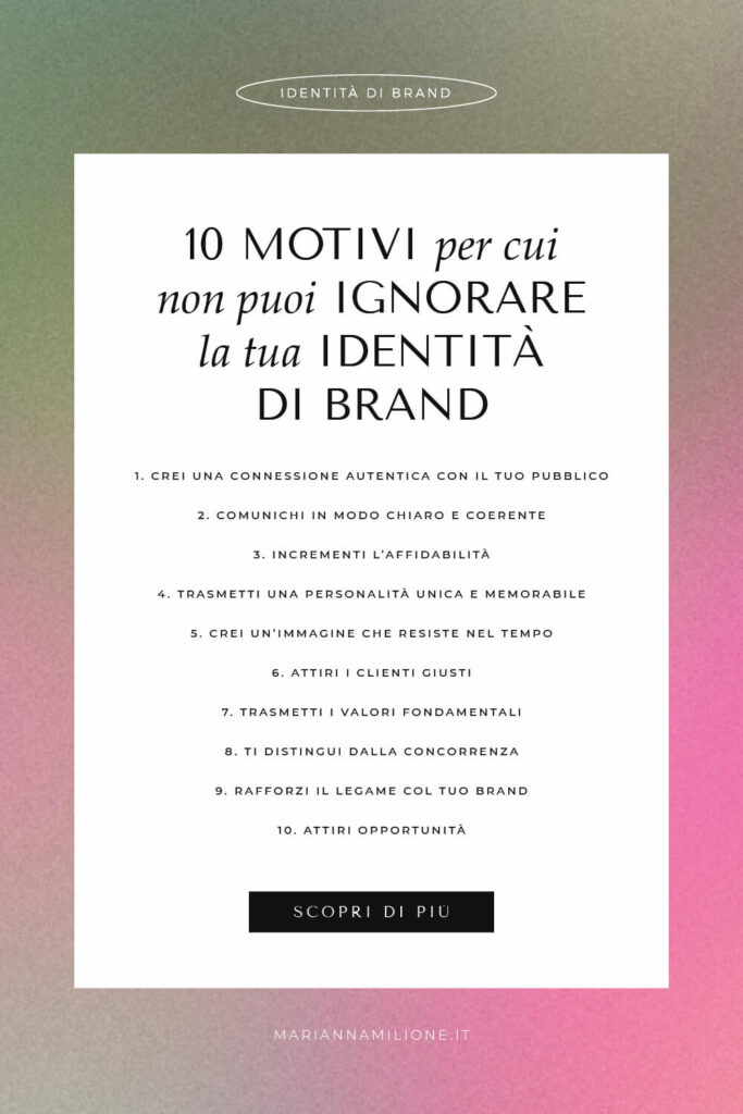 Un’identità di brand chiara crea una connessione emotiva con il pubblico. Non è magia: è psicologia! Quando il tuo brand comunica valori e missione in modo sincero, il pubblico si riconosce nella tua storia e diventa parte integrante della tua community. Se le persone si riconoscono nei tuoi valori e nel tuo stile, sceglieranno te invece del competitor.